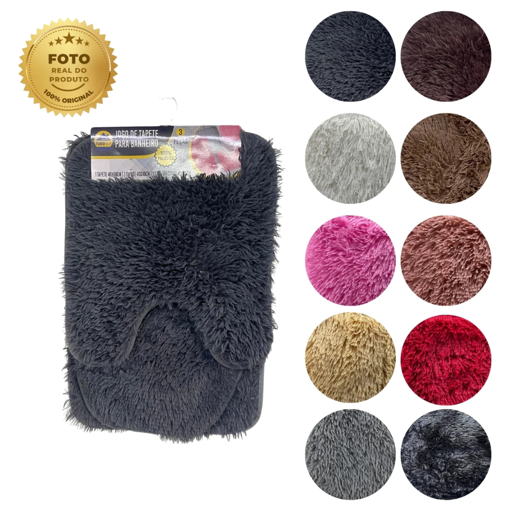 Jogo de banheiro kit felpudo e macio para decorar o banheiro, diversas cores, 3 peças, 2 tapetes e 1 capa sanitária poliéster antiderrapante.